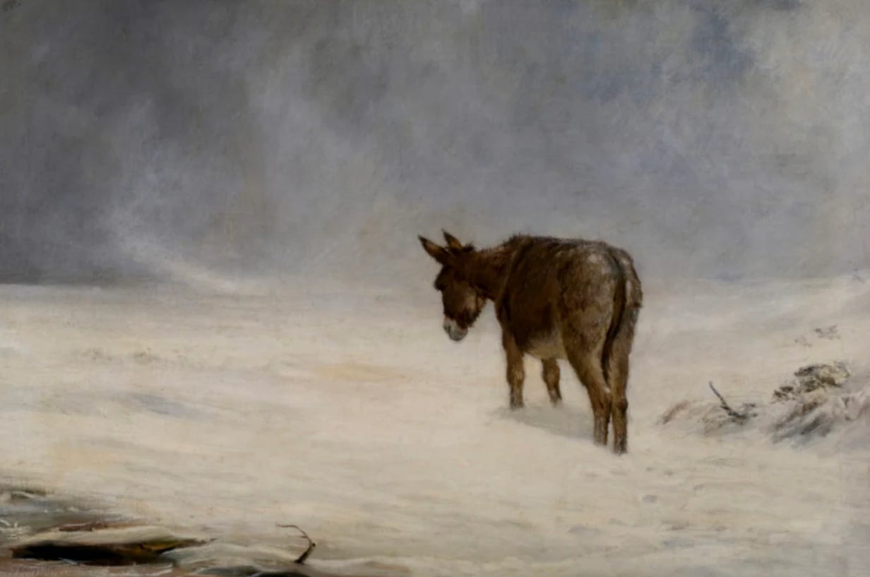 At this, the donkey stirred and rose to his feet, shaking the dust from his back. Seeing Travel he gave a small, welcoming bray. Travel ruffled the mane between his ears.